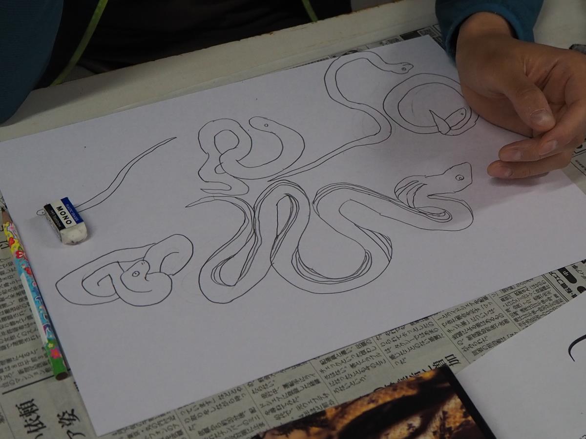 来年は、巳年です。今年もカレンダーの原画を描き始めました。参考になる写真や絵を見ながら、「恐いね、気持ち悪いね」等と言いながら、実際は楽しそうに原画を仕上げてくれました。